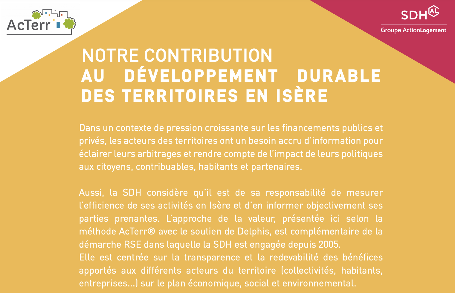 L'activité de la SDH repose sur sa raison d'être : "Fort de notre ancrage local et de notre engagement RSE, nous contribuons au développement durable des territoires en favorisant le lien entre l'emploi et le logement. Nous mobilisons notre expertise et notre capacité d'innovation technique et sociale au service de nos clients". Toutes les activités sont orientées vers un but commun : créer de la valeur pour chacune de ses parties prenantes.